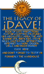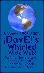 The first site created was ¡DavE!'s Whirled Wide Web!-This site was created before DATOMBAR.COM and featured a weekly newsletter, fun links to other websites you should know about, music news and a monthly feature. Some of the most popular monthly features were-The Concrete Blonde Tribute page, The Clairvoyant ¡DavE!, The Fleetwood Mac tribute page, and The Anti-Barbie Site to name a few. By the way, Whirled is spelled this way intentionally as the site was usually put together at the last minute!